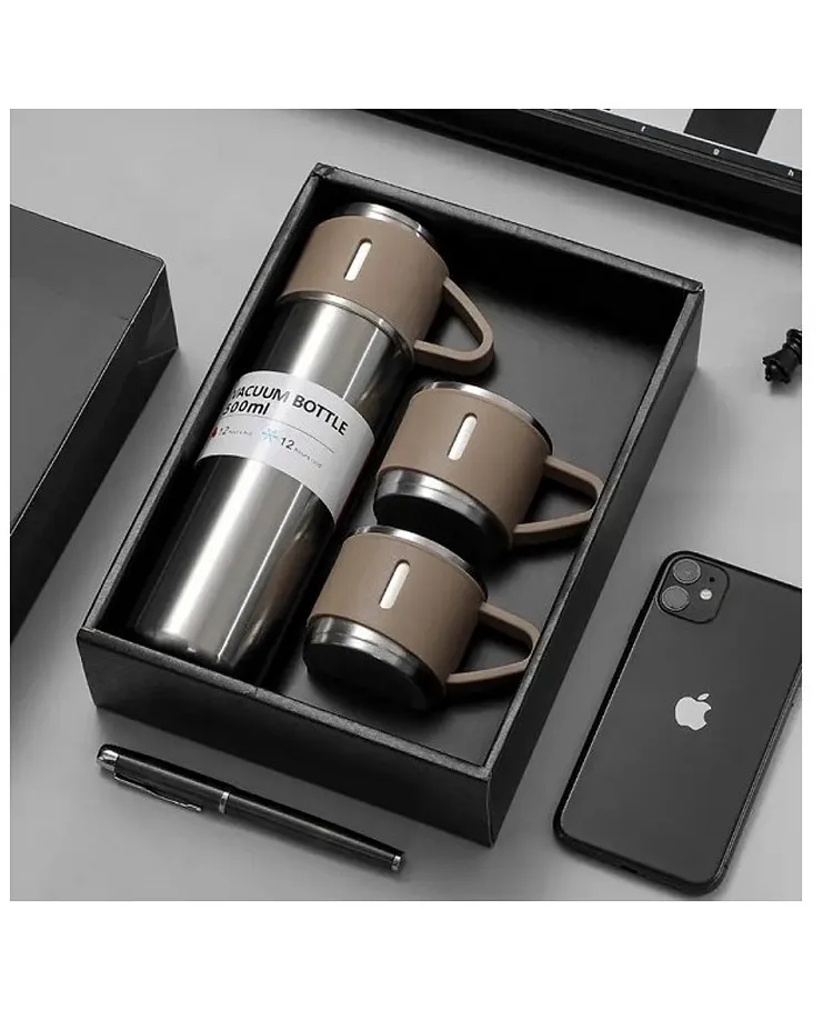 Stainless Steel Vacuum Flask Set with 3 Steel Cups (Set of 3 Pcs) | Brown | 500 ml