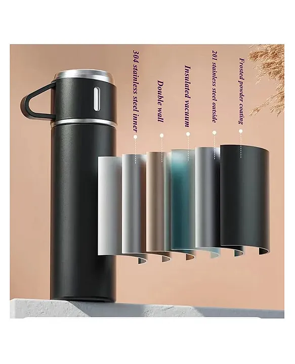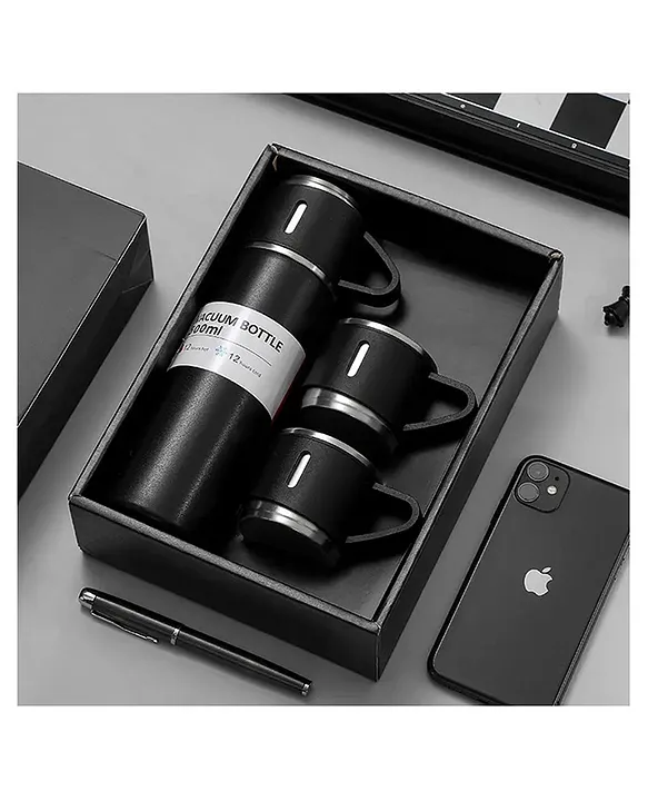 Stainless Steel Vacuum Flask Set with 3 Steel Cups (Set of 3 Pcs) | Black | 500 ml