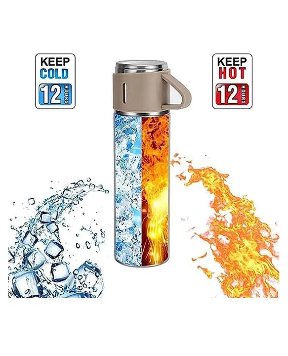 Stainless Steel Vacuum Flask Set with 3 Steel Cups (Set of 3 Pcs) | Brown | 500 ml
