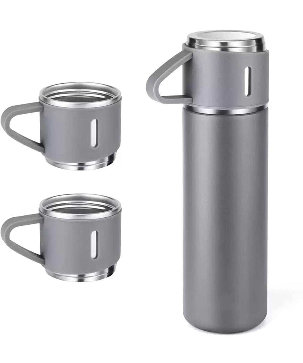 Stainless Steel Vacuum Flask Set with 3 Steel Cups (Set of 3 Pcs) | Grey | 500 ml