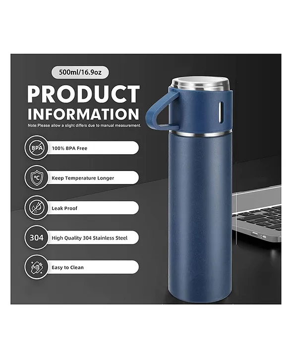 Durable stainless steel vacuum flask set includes a 500ml insulated flask and 3 sleek steel cups, perfect for keeping beverages hot or cold while on the go. Ideal for travel, picnics, or outdoor adventures.